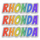 This multicolored, vibrant, and exciting sticker design features the common first name or given name "RHONDA", with the letters of the name having a colourful rainbow spectrum inspired gradient colouring pattern. It might be a fun present to give to somebody named Rhonda. [~Z0000361]