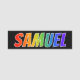 This fun, vibrant, multicolored name tag design features the common first name "SAMUEL", with the letters of the name having a colourful rainbow spectrum like gradient colouring pattern, on a black coloured background. A nametag like this might be worn by a volunteer, an employee, or a staff member named Samuel, to help identify the wearer to customers or other people. [~Z0000344]