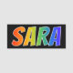 This fun, vibrant, multicolored name tag design features the common first name "SARA", with the letters of the name having a colourful rainbow spectrum like gradient colouring pattern, on a black coloured background. A nametag like this might be worn by a staff member, an employee, or a volunteer named Sara, to help identify the wearer to others. [~Z0000344]