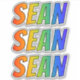 This exciting, multicolored, and vibrant sticker design features the common first name or given name "SEAN", with the letters of the name having a colourful rainbow spectrum inspired gradient colouring pattern. It might be a fun present to give to somebody who is named Sean. [~Z0000361]