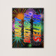 This vibrant and lively birthday-themed jigsaw puzzle design features the message "HAPPY BIRTHDAY, SELENA" having a colourful rainbow spectrum inspired gradient pattern, and a fun bursting celebratory fireworks inspired background pattern. An exciting puzzle like this might be a fun way to send a birthday greeting message to somebody named Selena. [~Z0000465]