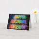 This vibrant, multicolored and fun birthday greeting card design features the message "HAPPY BIRTHDAY," and the common first name "SERENITY" with the letters having a colourful rainbow spectrum like gradient colouring pattern. The background of the front also features a colourful pattern inspired by the appearance of bursting celebratory fireworks. The inside features a custom greeting message, or could perhaps be cleared and left blank if a message is to be written by hand instead. A birthday greeting card like this might be a fun way to acknowledge the birthday of somebody named Serenity. [~Z0000350]