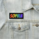 This fun, vibrant, multicolored name tag design features the common first name "SOPHIA", with the letters of the name having a colourful rainbow spectrum like gradient colouring pattern, on a black coloured background. A nametag like this might be worn by a customer service representative, a staff member, or a volunteer whose name is Sophia, to help identify the wearer to others. [~Z0000344]
