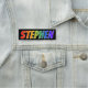 This fun, vibrant, multicolored name tag design features the common first name "STEPHEN", with the letters of the name having a colourful rainbow spectrum like gradient colouring pattern, on a black coloured background. A nametag like this might be worn by a customer service representative, an employee, or a volunteer who is named Stephen, to help identify the wearer to customers or other people. [~Z0000344]