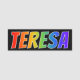 This fun, vibrant, multicolored name tag design features the common first name "TERESA", with the letters of the name having a colourful rainbow spectrum like gradient colouring pattern, on a black coloured background. A nametag like this might be worn by a volunteer, a customer service representative, or an employee whose name is Teresa, to help identify the wearer to others. [~Z0000344]