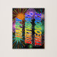 This vibrant and exciting birthday-themed jigsaw puzzle design features the message "HAPPY BIRTHDAY, THEODORE" having a colorful rainbow spectrum inspired gradient pattern, and a lively bursting celebratory fireworks inspired background pattern. A vibrant puzzle like this might be used to send birthday wishes to somebody named Theodore. [~Z0000465]