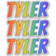 This vibrant, exciting, and fun sticker design features the common first name or given name "TYLER", with the letters of the name featuring a colourful rainbow spectrum inspired gradient colouring pattern. It might be a fun gift to give to somebody whose first name is Tyler. [~Z0000361]