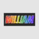 This fun, vibrant, multicolored name tag design features the common first name "WILLIAM", with the letters of the name having a colourful rainbow spectrum like gradient colouring pattern, on a black coloured background. A nametag like this might be worn by a volunteer, a staff member, or an employee whose first name is William, to help identify the wearer to others. [~Z0000344]
