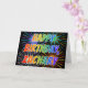 This vibrant, multicolored and fun birthday greeting card design features the message "HAPPY BIRTHDAY," and the common first name "ZACHARY" with the letters having a colourful rainbow spectrum like gradient colouring pattern. The background of the front also features a colourful pattern inspired by the appearance of bursting fireworks. The inside features a personalised greeting message, or could perhaps be cleared and left blank if a message is to be written by hand instead. A birthday greeting card like this could be a fun way to send a customisable birthday greeting message to somebody named Zachary. [~Z0000350]