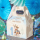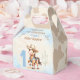 First Rodeo themed 1st Birthday small favour box featuring a cute happy cowboy horse in pastel blue and beige and beige cow skin pattern with old paper texture. You can choose from 3 sizes of these gable favour boxes. Easily personalise all the text including the number of the Birthday. - Kate Eden Art