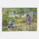 First Steps (after Millet) by Vincent van Gogh is a vintage fine art post impressionism daily life portrait painting featuring a daily life scene with a peasant farmer and his wife (mum and dad) with their child taking his or her first steps. The family is working in the vegetable garden with their house, a cottage, in the background.