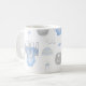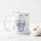 Created for a first time mum of a baby boy and with a baby hat, pacifier, bottle, socks, etc., this mug comes with the option to personalise it. The name will show on the grey baby bib. The main colours for this mug are shades of light blue, grey, and white.