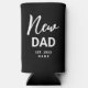 Give a dad to be this First Time New Dad Established Personalised Seltzer Can Cooler as a gift. It has a modern typography design with "new dad" in chunky white script and block lettering followed by established year and name. Design is on both sides front and back of black can cooler.
