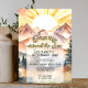 Boho and rustic gender-neutral first birthday design "First trip around the sun" with a watercolor style landscape with mountains, fir trees, and a rising sun.