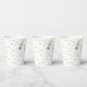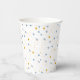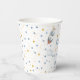 Outer space or first trip around the sun first birthday paper cup featuring a sun, moon, stars, spaceship and astronaut in an orange and grey blue color.