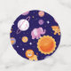 a space-themed pattern. This pattern features a variety of celestial objects and animals. There are planets of different sizes and colors, such as purple, orange, and yellow, along with a bright sun. Additionally, there are animated animals, including a pink elephant, a yellow lion, and a purple hippopotamus, floating amidst the celestial bodies. The background is a deep black, accentuating the bright colors of the planets and animals.
