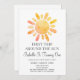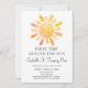 A sweet glowing orange gold boho style sun with rays, first trip around the sun, watercolor boho style kid's birthday party invitation. A bold lush orange gold watercolor.