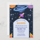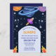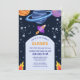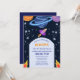 the front design shows a birthday invitation for kids in orange and blue with a galaxy themed background. this cute unique design will be ideal for any kid's birthday.