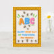 Custom front, add a name, Happy First Day of Preschool, paper greeting card with bees and honey comb. The bees are gathering around the letter B on the cover. Cute Bee verse inside. Change or add to the text on the cover and inside as desired. Art, image, and verse © Shoaff Ballanger Studios, 2024.
