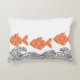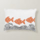 Fish and waves throw pillow. The fish are rendered in a soft terracotta orange and decorated with a delicate floral pattern, adding a whimsical, Japanese-inspired touch. The waves below are illustrated with fine black lines in a traditional woodblock style,