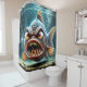 This shower curtain has an angry fish on it.