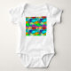 This baby bodysuit has a design of a school of fish in green, blue, orange, yellow, red, pink, and blue-green swimming in the ocean. Change the text or remove it completely if desired.