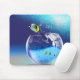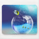 This mouse pad has a picture of a fish bowl sitting at the bottom of the ocean on it.