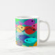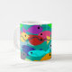 This mug has a design of a school of fish in green, blue, orange, yellow, red, pink, and blue-green swimming in the ocean.
