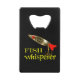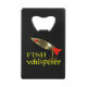 Funny fishing bottle opener for all fishermen and fisherwomen. Fish Whisperer in text with a full colour fishing lure near the top. Printed front and back.