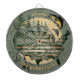 Rustic forest green American flag and fishing dartboard with custom family name and established date. Easy to add your own text. Dart board makes a great gift for the fisherman in your life. Green and beige colour scheme. Perfect for a man cave or game room.