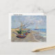 A fine art postcard with the post-impressionist painting, Fishing Boats on the Beach at Les Saintes-Maries-de-la-Mer (1888) by Vincent van Gogh (1853-1890) a Dutch artist. Four boats moored on the sand at the water's edge.