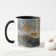 Celebrate the season by the sea with this elegant coastal Christmas mug. A row of fishing boats, decorated with festive wreaths and glowing lights, rests in a snowy harbor as a Christmas tree sparkles in the distance.