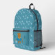 Cute kid blue backpack , for going back to school , featuring a brown bear carrying a fishing rod in one hand and a bucket full of fish in the other . The rest of the back has a fish bone pattern . Personalised it with the child's initials .