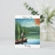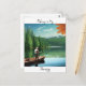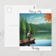 Keep in touch with this postcard showing a man fishing in a canoe on a lake surrounded by pine trees and mountains with beautiful reflections in the water.