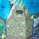 This favour box features fishing lure illustrations inspired by vintage fishing lures in shades of red and yellow on a pale teal background.