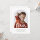 A simple 5th Birthday invitation featuring your own photo in an arch shape and the words 'five.' over the top.
