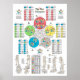 The five elements theory of acupuncture poster. The wall chart list the element points (Fire, Earth, Metal, Water and Wood). All color coordinated for each of the meridians. The Back Shu, Front Mu, Source, Luo, Xi Cleft, Entry, Exit and Horary points are listed in large type for each meridian. The horary points show the time when the meridian is most active. All of these points are marked on the illustrations of the arms and legs including a table of the tonification and sedation points. The large font and colors make this an easy to read wall chart reference. Yin meridians "Zang organs" are in the inside of the circle, Yang meridians "Fu organs" are on the outside. For acupuncturists, practitioners trained in Touch for Health (TFH) and Applied Kinesiology (AK).