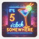 Bright and colourful rainbow neon sign displaying "Five 'O Clock Somewhere" text alongside a vibrant cocktail glass on a brick wall backdrop
