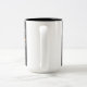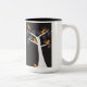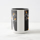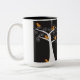 Five adorable abstract orange birds hang out in a white tree against a black background on a mug. Image is on both sides of mug.