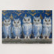 This jigsaw puzzle features five white owls standing in a row with a blue and gold fleur-de-lys background. It would make a beautiful gift for a jigsaw enthusiast.