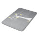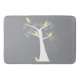Five adorable abstract yellow birds hang out in a white tree against a grey background on a pretty bath mat.
