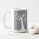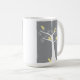 Five adorable abstract yellow birds hang out in a white tree against a grey background on a mug