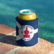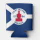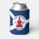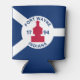 Can cooler with flag of city of Fort Wayne, Indiana; blue and white flag and with red blockhouse in the center and three illustrations in the blue field - illustration of Native American’s head, French fleur-de-lys and British lion