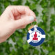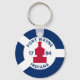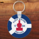 Button Keychain with flag of city of Fort Wayne, Indiana; blue and white flag and with red blockhouse in the centre and three illustrations in the blue field - illustration of Native American’s head, French fleur-de-lys and British lion
