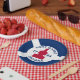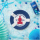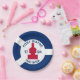 Paper Plate with flag of city of Fort Wayne, Indiana; blue and white flag and with red blockhouse in the centre and three illustrations in the blue field - illustration of Native American’s head, French fleur-de-lys and British lion