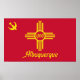 This design features the city flag of Albuquerque, which is the most populous city in the U.S. state of New Mexico. The city's nicknames are The Duke City and Burque, both of which refer to its founding in 1706 by Nuevo México governor Francisco Cuervo y Valdés as La Villa de Alburquerque. The city of Albuquerque serves as the county seat of Bernalillo County; it is situated in north-central New Mexico.