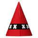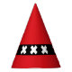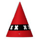 Party Hat with design with flag of Amsterdam, capital city of Netherlands, red and black flag with three white Saint Andrew’s crosses in the centre