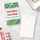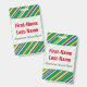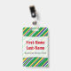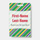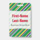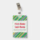 This badge design features a pattern of stripes (or lines) of various widths, coloured green, yellow, blue or white. These colours were inspired by those of the national flag of Brazil. It also features a personalised name in red coloured text within a light coloured area. There is also a custom message under the name that could show information such as a job role name, or a profession, or a business/company name. [~Z0000176]