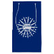 Paper bag with flag of city of Buffalo, New York; blue flag with white seal of the city and 13 lightning bolts
