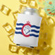 Can cooler with flag of city of Cincinnati, Ohio; white flag with three blue waves with red “C” in the centre